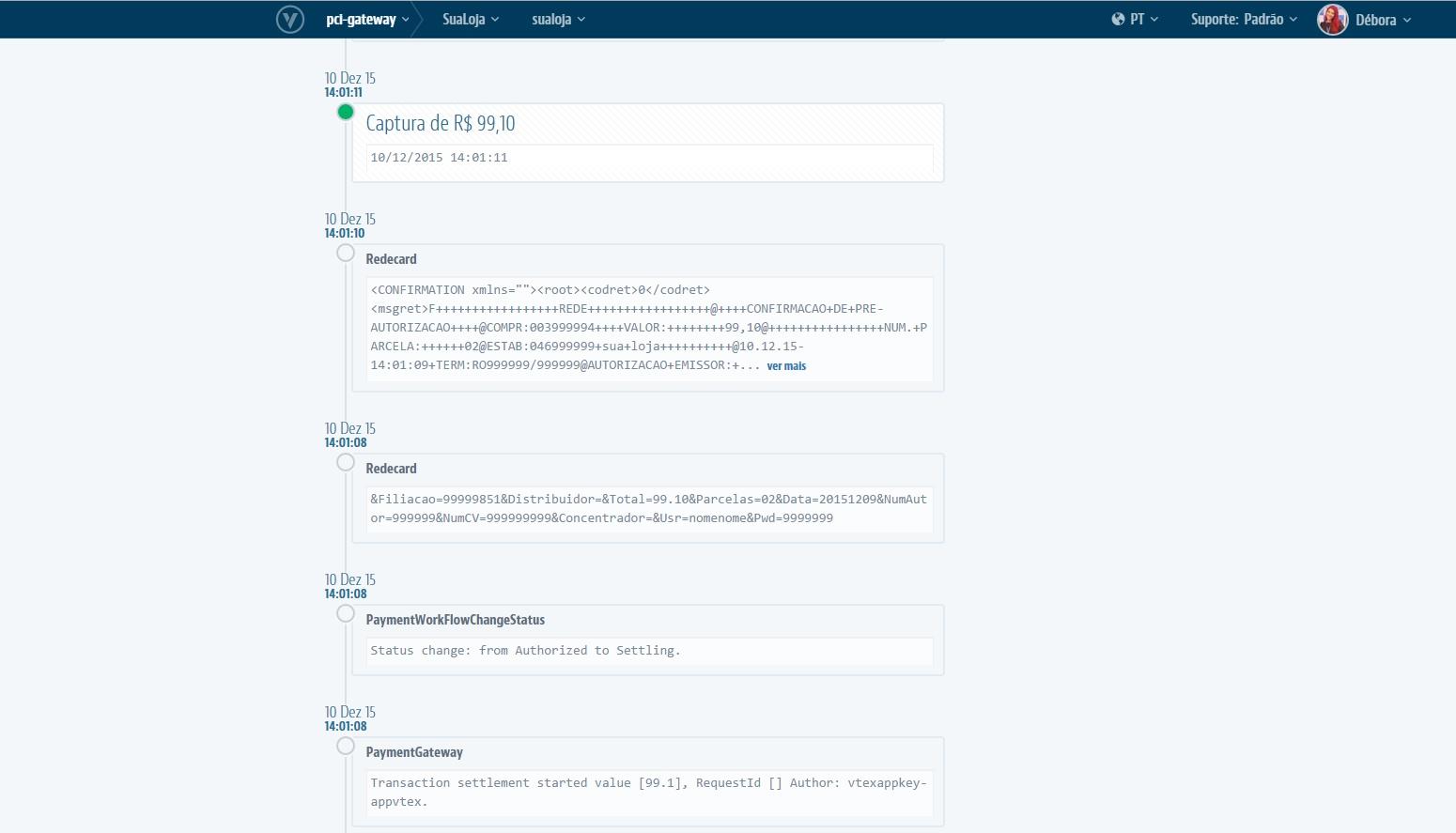 A parte mais importante dessa tela é o log de interações da transação. Aqui fica registrada toda a comunicação da VTEX com os afiliados cadastrados – antifraude, gateways e adquirentes –, inclusive mensagens de sucesso e erro, com seus respectivos códigos.
