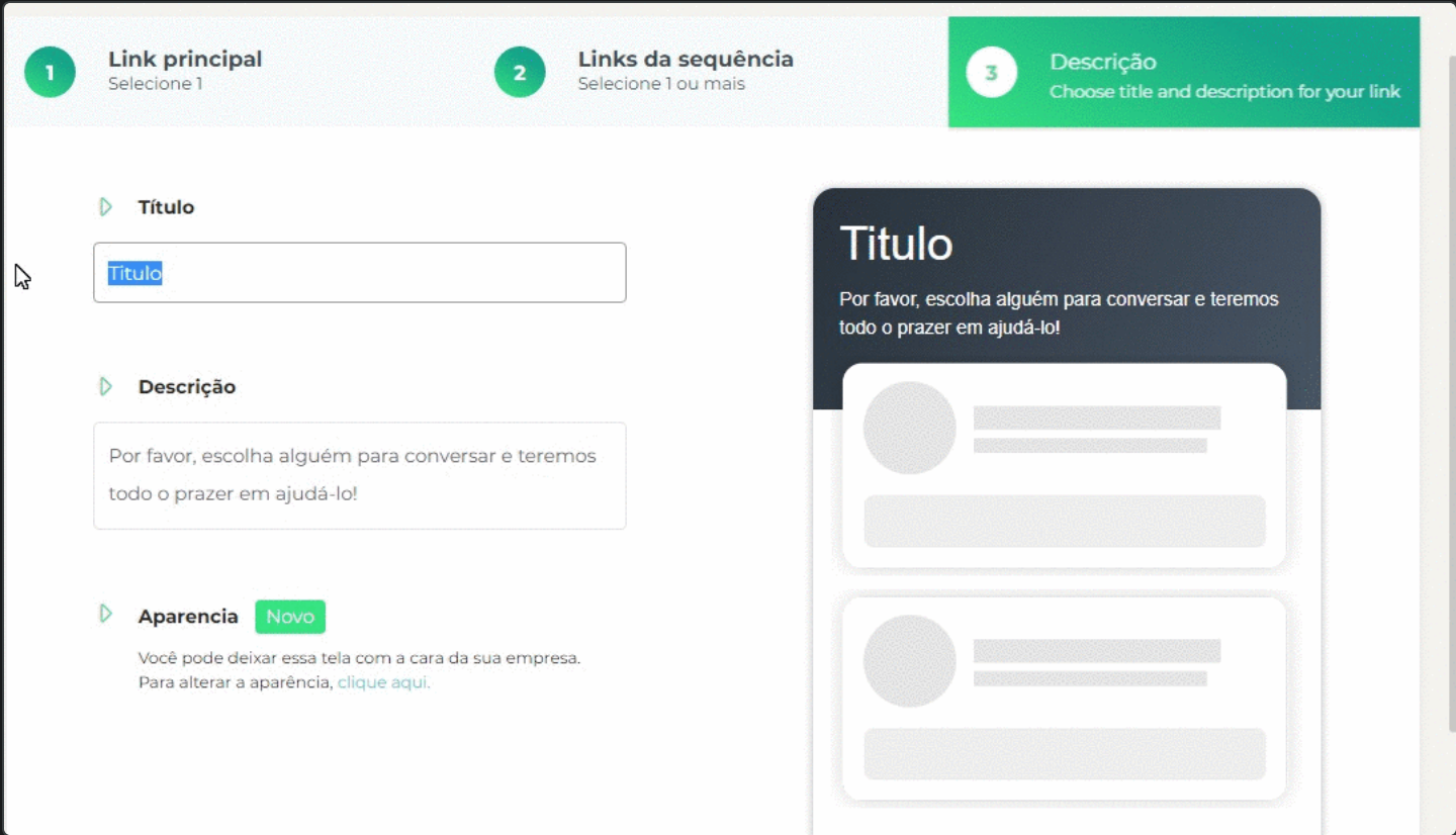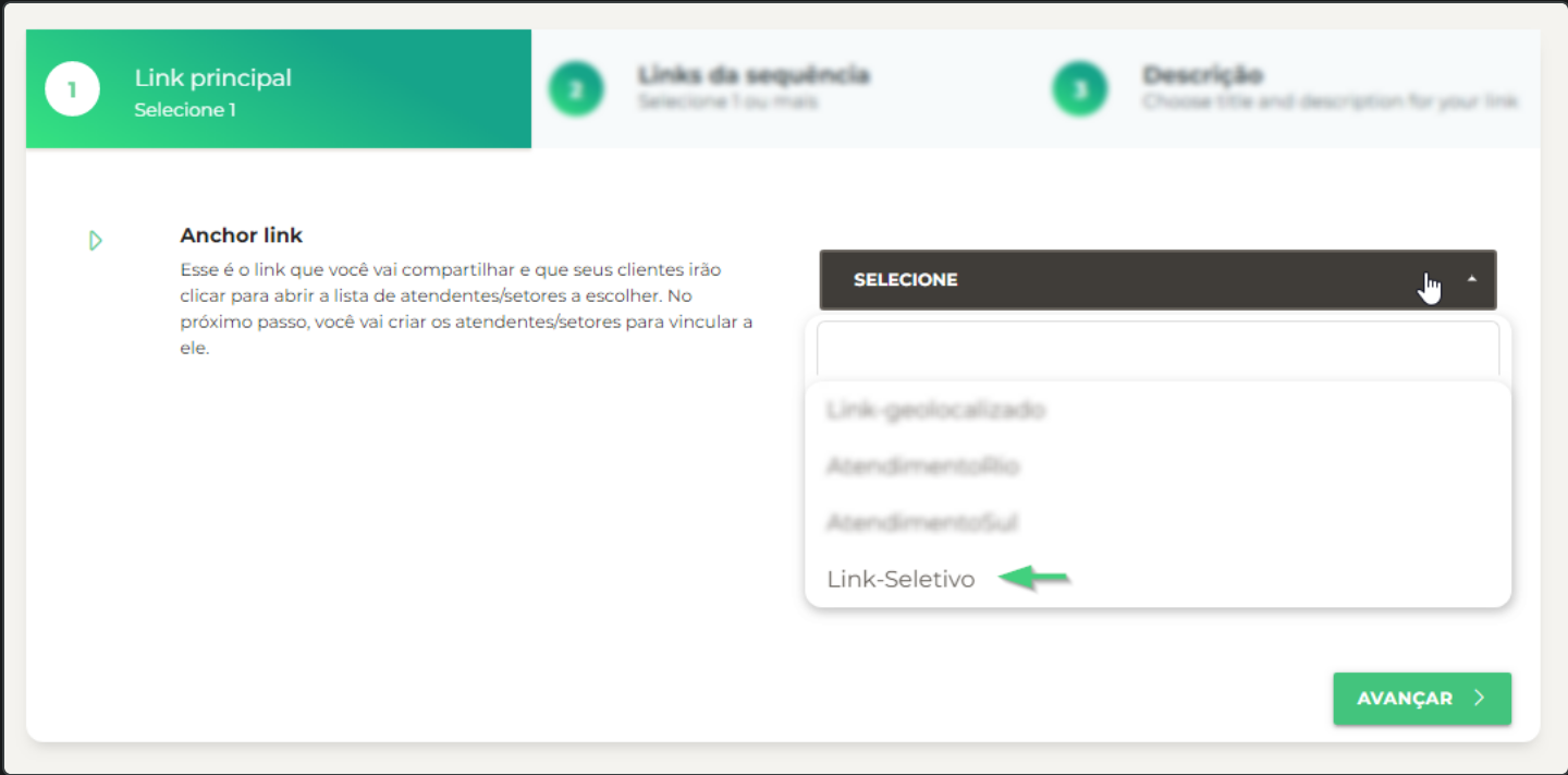 Em Link Âncora, como o próprio nome já diz, você irá selecionar o link principal da central. Esse é o link que você irá divulgar, será o link responsável por fazer a ligação com os demais atendentes.