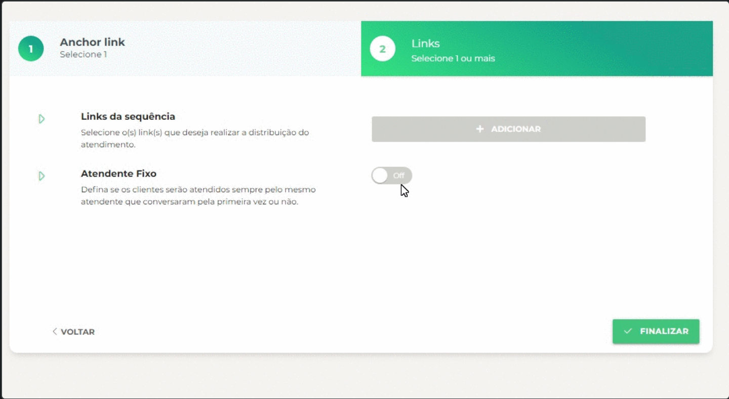 NOTA: Em atendimento fixo (opcional), você irá escolher se um cliente que já falou com algum atendente, ao clicar novamente no link principal (/minhacentral), cairá sempre para o mesmo atendente.