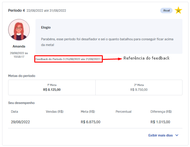 O feedback fica disponível apenas no período seguinte. A data de registro é exibida logo abaixo do comentário.
